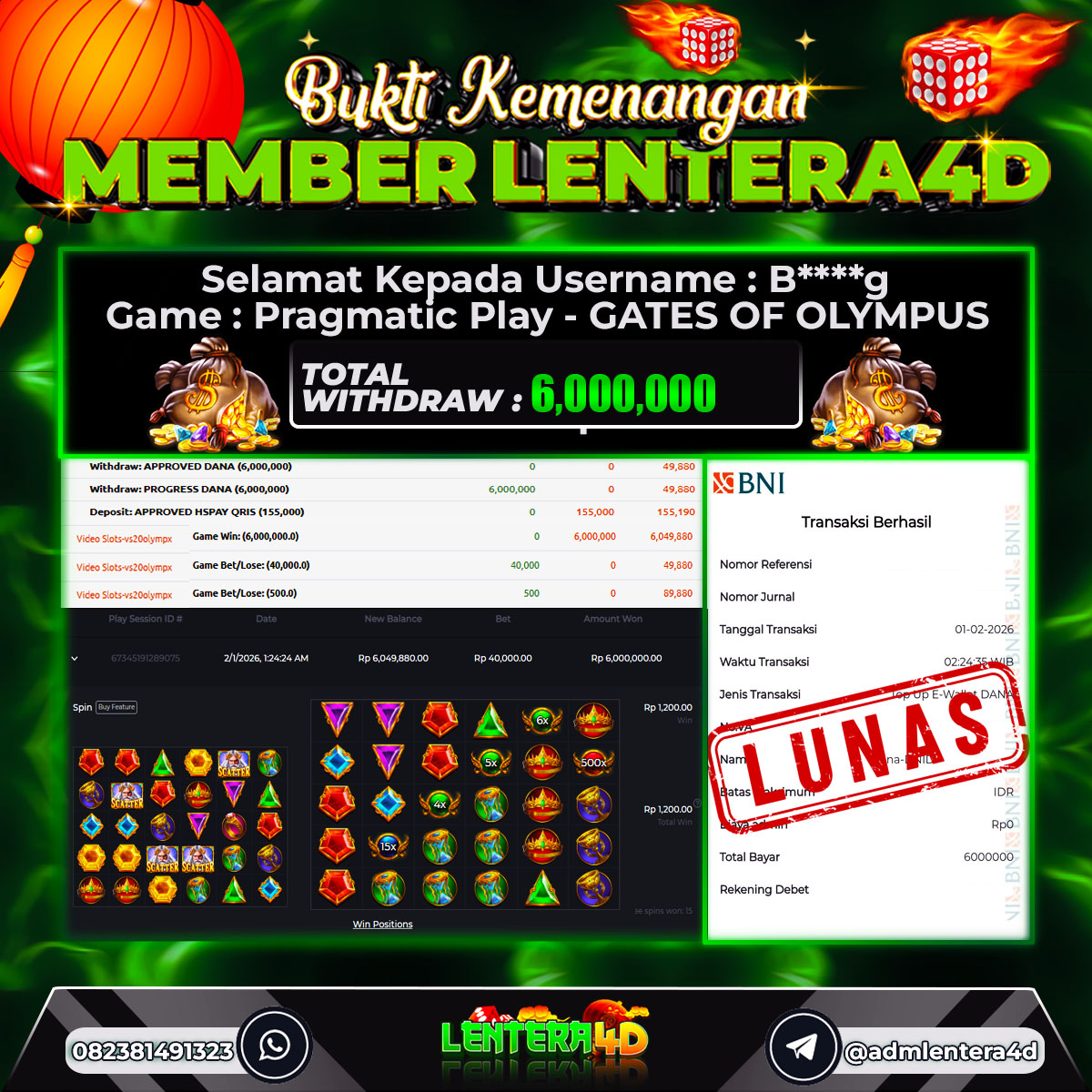 JACKPOT MAIN GATES OF OLYMPUS 01 FEBRUARY 2026, Jackpot Slot Gacor, Kemenangan Slot, Bukti Kemenangan Slot, Kemenangan Slot Pragmatic Play, Menang Slot online, Slot Gacor, Situs Aman Terpercaya, WD Berapapun Pasti DI Bayar Tuntas, Maxwin Slot Online.