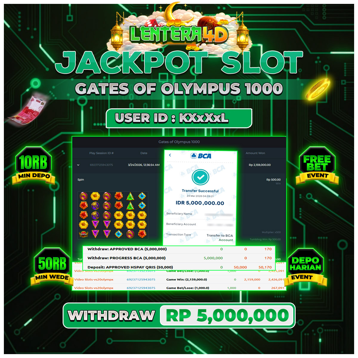 Setiap hari, member Lentera4D berhasil meraih jackpot besar dari berbagai provider slot ternama yang kami sediakan, seperti Pragmatic Play, Habanero, PG Soft, dan masih banyak lagi. Kami secara rutin menampilkan bukti screenshot atau rekapan kemenangan yang berhasil diraih, mulai dari kemenangan ratusan ribu hingga puluhan juta rupiah. Semua slip kemenangan ini kami hadirkan untuk membuktikan bahwa di Lentera4D, peluang menang itu nyata.