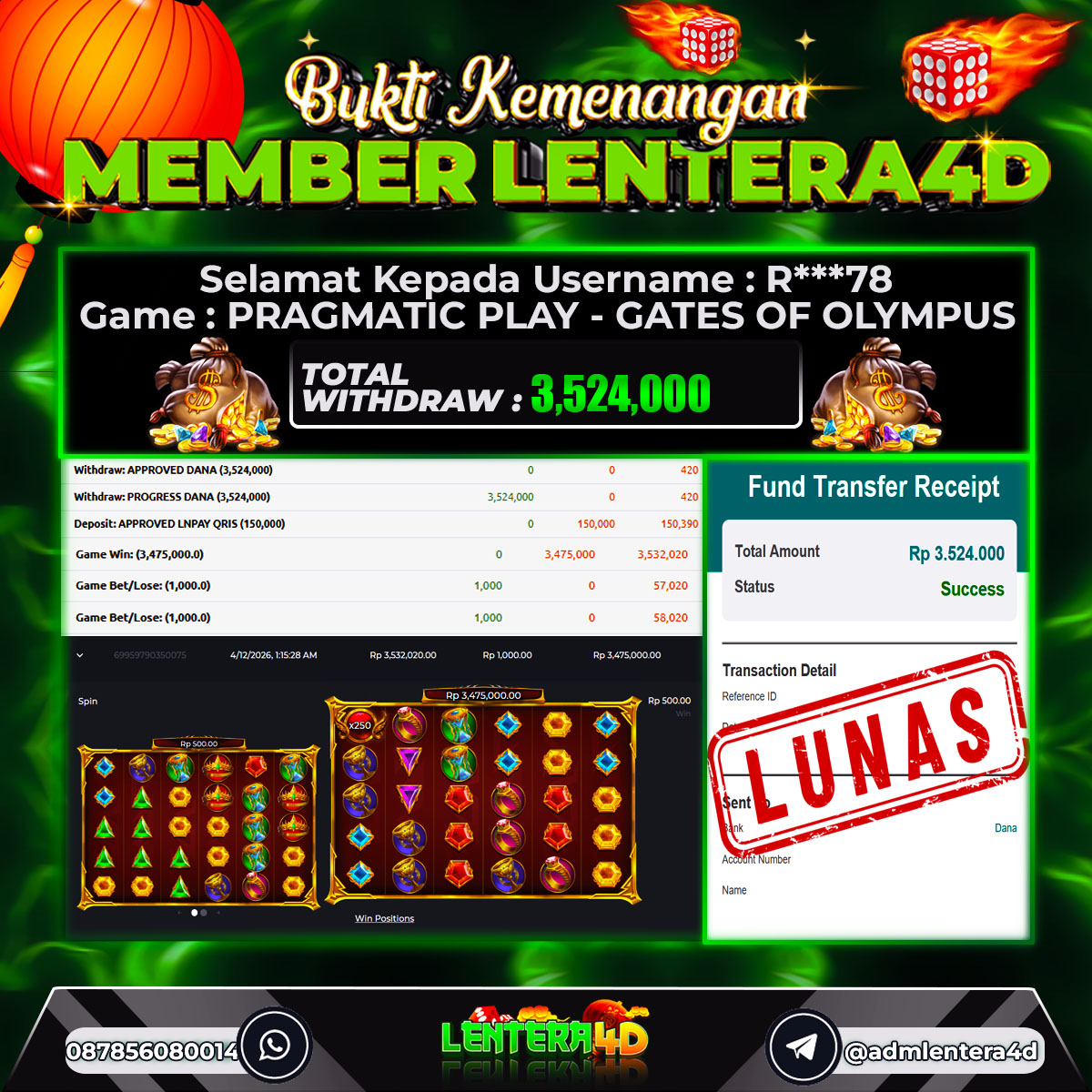Setiap hari, member Lentera4D berhasil meraih jackpot besar dari berbagai provider slot ternama yang kami sediakan, seperti Pragmatic Play, Habanero, PG Soft, dan masih banyak lagi. Kami secara rutin menampilkan bukti screenshot atau rekapan kemenangan yang berhasil diraih, mulai dari kemenangan ratusan ribu hingga puluhan juta rupiah. Semua slip kemenangan ini kami hadirkan untuk membuktikan bahwa di Lentera4D, peluang menang itu nyata.