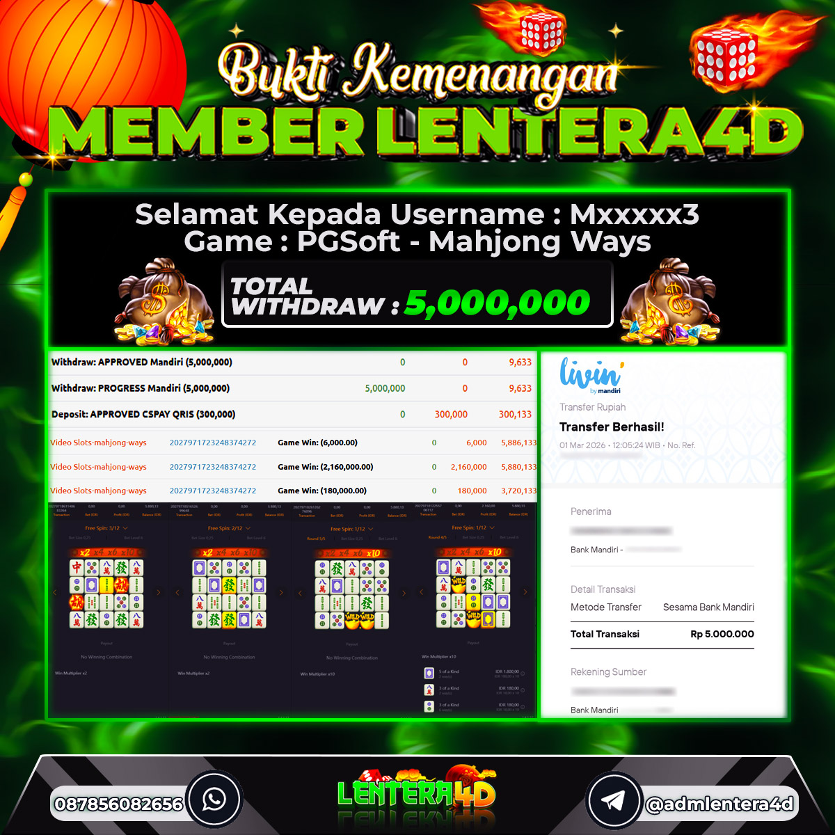 Setiap hari, member Lentera4D berhasil meraih jackpot besar dari berbagai provider slot ternama yang kami sediakan, seperti Pragmatic Play, Habanero, PG Soft, dan masih banyak lagi. Kami secara rutin menampilkan bukti screenshot atau rekapan kemenangan yang berhasil diraih, mulai dari kemenangan ratusan ribu hingga puluhan juta rupiah. Semua slip kemenangan ini kami hadirkan untuk membuktikan bahwa di Lentera4D, peluang menang itu nyata.