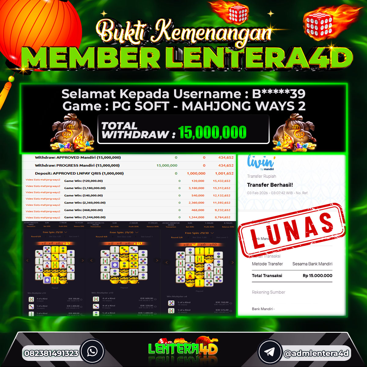 Satu lagi Bukti JP dan Pembarayan Sah Dan Dapat Dipertanggung Jawabkan, WD Berapapun Pasti Dibayar Lunas Hanya di Situs LENTERA4D. Hati Hati Kepada Pihak Pihak Yang Mengatas namakan Pihak LENTERA4D Untuk Melakukan Penipuan.