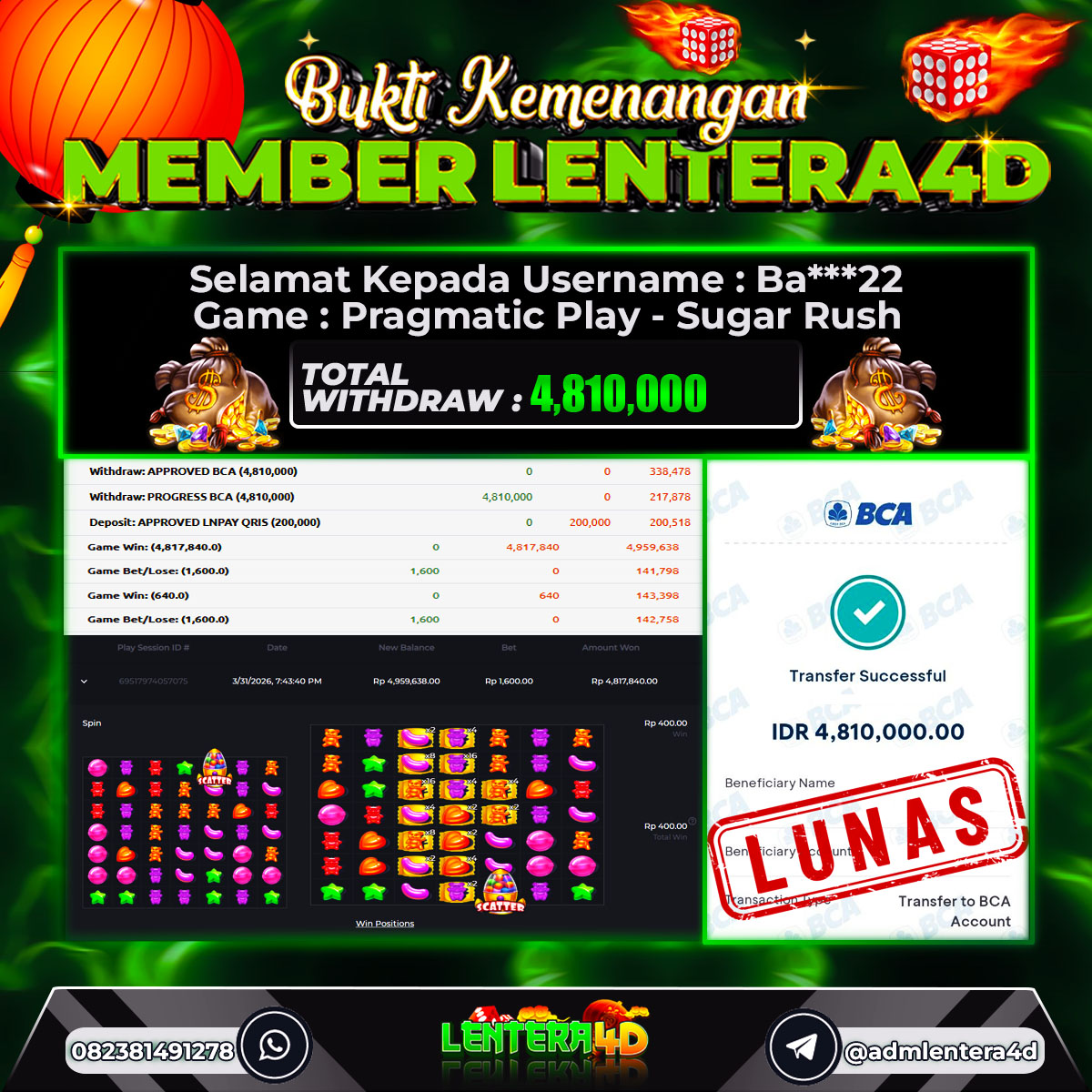 Satu lagi Bukti JP dan Pembarayan Sah Dan Dapat Dipertanggung Jawabkan, WD Berapapun Pasti Dibayar Lunas Hanya di Situs LENTERA 4D. Hati Hati Kepada Pihak Pihak Yang Mengatas namakan Pihak LENTERA4D Untuk Melakukan Penipuan.