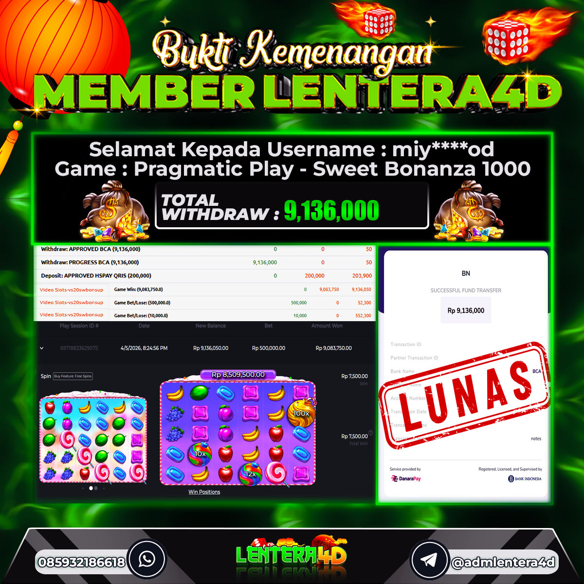 Setiap hari, member Lentera4D berhasil meraih jackpot besar dari berbagai provider slot ternama yang kami sediakan, seperti Pragmatic Play, Habanero, PG Soft, dan masih banyak lagi. Kami secara rutin menampilkan bukti screenshot atau rekapan kemenangan yang berhasil diraih, mulai dari kemenangan ratusan ribu hingga puluhan juta rupiah. Semua slip kemenangan ini kami hadirkan untuk membuktikan bahwa di Lentera4D, peluang menang itu nyata.